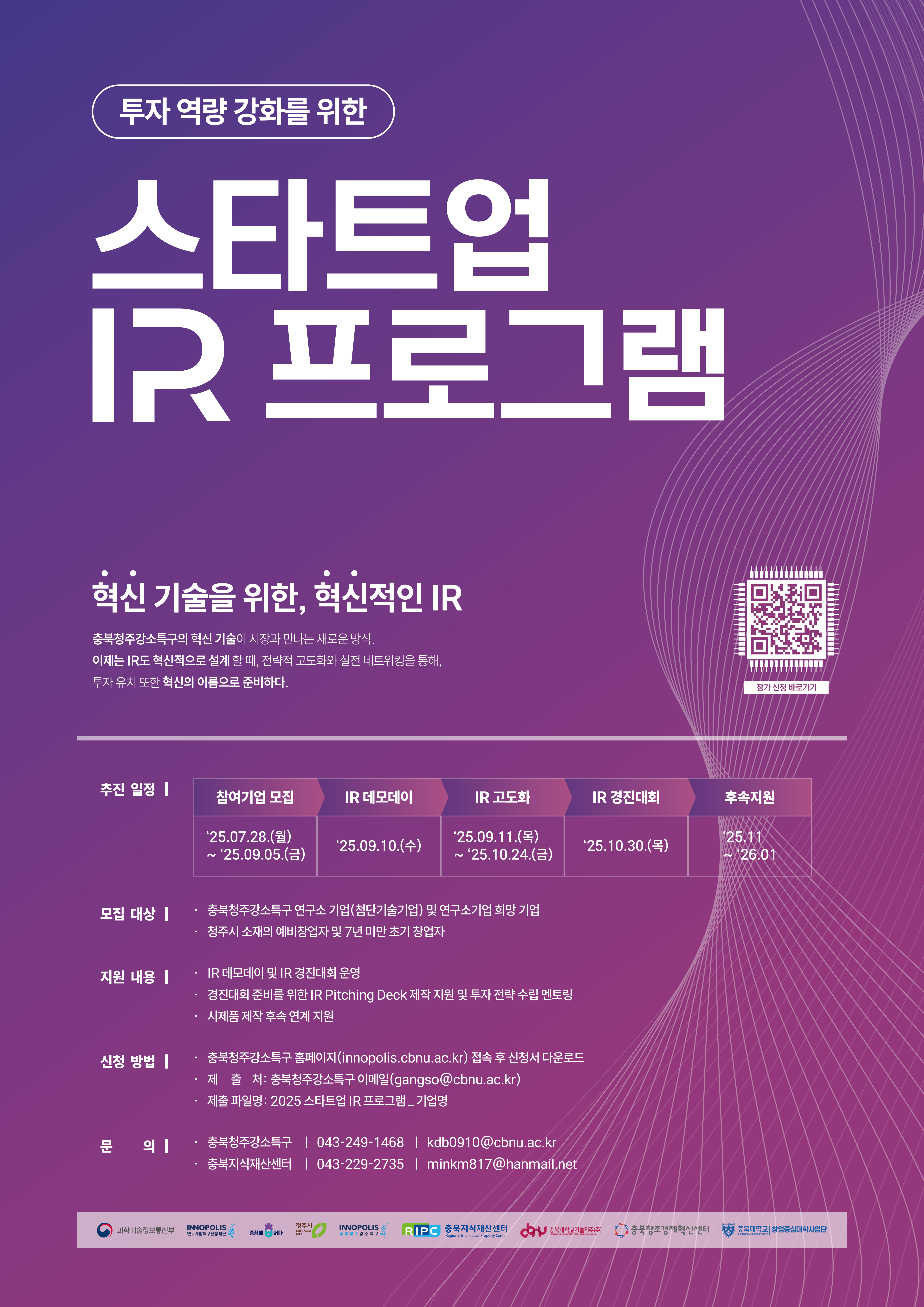 충북청주강소연구개발특구에서는 다음과 같이 스타트업 IR 프로그램 참여기업 모집을 하고 있습니다.