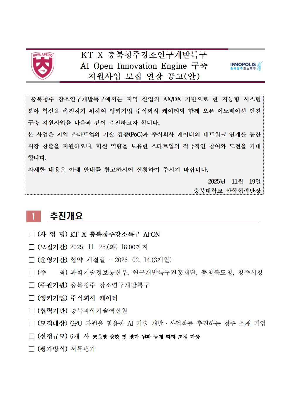 [2025] KT x 충북청주 강소특구 오픈 이노베이션 엔진 구축 지원사업 모집 연장.zip